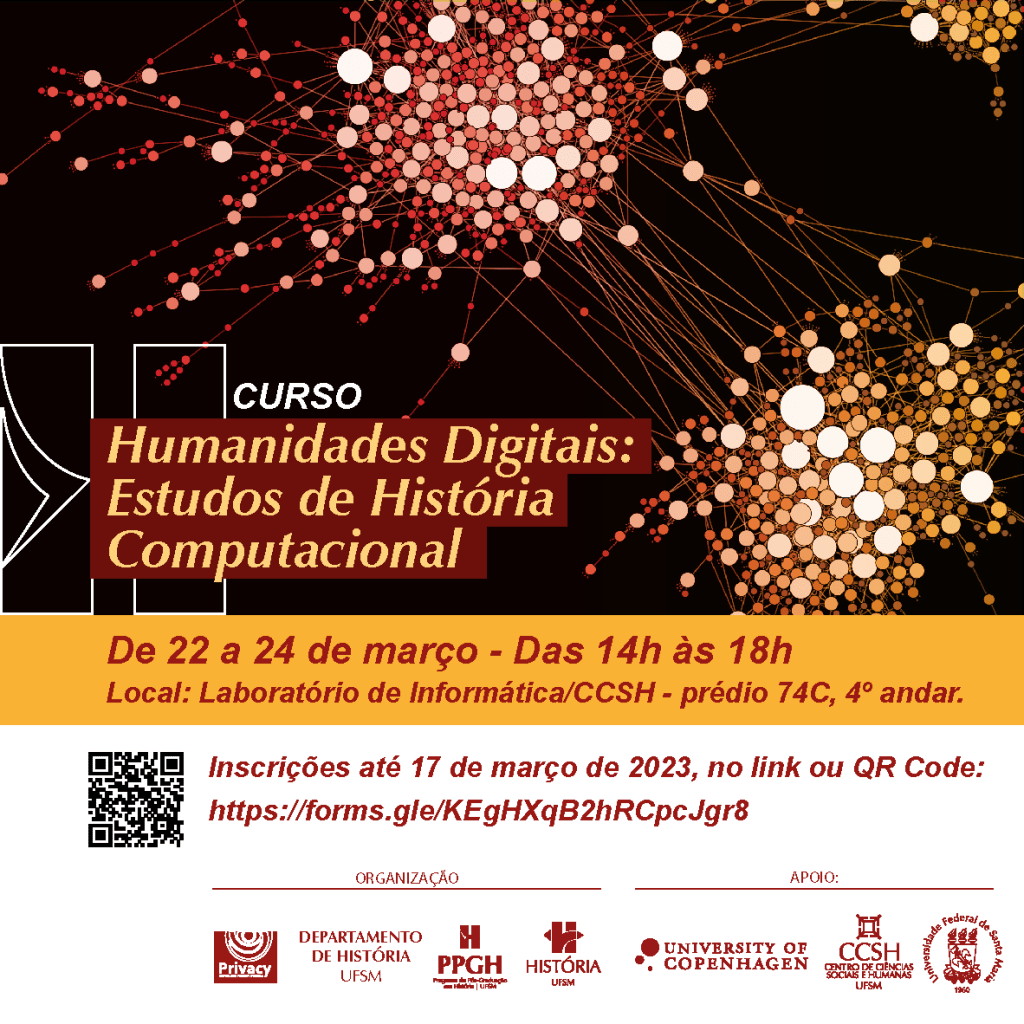 | 23 de março 2023 13:00-18:00 – Laboratório de Computação – UFSM Laboratório 4400, prédio 74C, 4º andar | Processamento de Linguagem Natural para Pesquisa Histórica Nadav Borenstein e Karolina Ewa Stanczak (Departamento de Ciências da Computação – Universidade de Copenhague) Esta sessão apresentará aos historiadores o campo do processamento de linguagem natural (PLN) e suas aplicações na pesquisa histórica. Abordaremos os fundamentos do PLN, incluindo coleta de conjuntos de dados, pré-processamento de texto e análise de texto, e exploraremos técnicas para extrair insights significativos de textos históricos, como classificação de documentos, modelagem de tópicos, reconhecimento de entidade nomeada e resolução de correferência. Também discutiremos as considerações éticas e as limitações do uso da PLN na pesquisa histórica. Para fornecer uma experiência prática, apresentaremos um estudo de caso de nosso próprio projeto de pesquisa, onde os alunos podem ver como os métodos de PLN são aplicados na pesquisa histórica do mundo real. Também demonstraremos algumas das APIs de PLN disponíveis, mostrando aos participantes como acessar e utilizar modelos de PLN pré-treinados em seus projetos. Por fim, teremos um workshop de ideação onde os participantes terão a oportunidade de debater e propor suas próprias ideias de projetos de pesquisa utilizando métodos de PLN. |